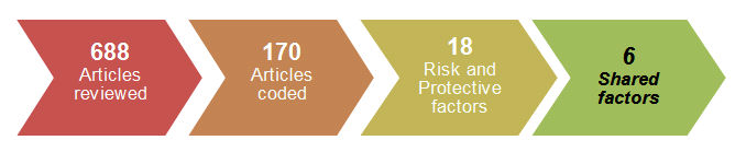 The college-specific systematic review identified 688 studies that explored the association of college environment-related factors that place youth at increased risk for, or protect them from substance misuse and/or mental health problems. Upon full-text review of 688 studies, 170 studies were found to include factors that were statistically associated (p < 0.05) with at least one substance misuse or one mental health problem. The factor and associated outcome information (substance misuse and/or mental health problem) gathered from these 170 studies was aggregated to generate 18 risk and protective factors, out of which 6 were found to be shared (i.e., associated with both substance misuse and mental health problems (Figure 1).